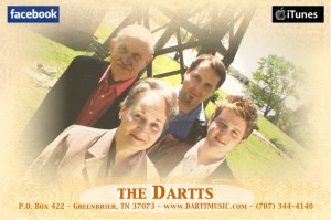 The calendar continues to fill up as Tracy and Sharon do much of the office work and scheduling from The Dartts’ Tennessee home base. These challenges aren’t holding The Dartts back, as they continue to write new music and are excited to announce the release of their largest project yet, “The God On The Mountain Legacy“. Released in September 2010, this film, produced by Don Dartt, highlights the impact that Tracy’s song, “God On The Mountain”, has had on people the world over. Look for “The God On The Mountain Legacy” this Winter on the NRB Television Network! The film is available on DVD and Digital Download. Also, to be released this Winter, “The God On The Mountain Legacy” CD, celebrating the song-writing legacy of Tracy Dartt. Look for it at music retailers and online through iTunes and other digital music providers. Tracy and Sharon have 4 children, Donald, Florence, Forrest, & Stone; Don Dartt, the oldest, is a producer at TBN Nashville, and has a wife and 2 children. Florence McLain, has a husband and 4 children. She and her husband, Steve, a Major in the U.S. Army, are currently serving in Norway. Forrest Dartt, works for the Triton Boat Company in the Nashville area, and has a wife and 4 children. Stone Dartt, a partner in The Dartts, not only sings with the family group, but is also the sound man, graphic design artist, and bus driver. The Dartts have their own website at www.DarttMusic.com. The Dartts invite you to visit www.Darttmusic.com and to sign their guestbook as well as join their e-mail list. You are also invited to attend The Dartts’ home church, Napa Valley Baptist Church in Napa, California.